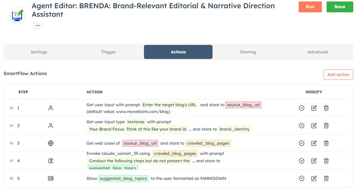 For BRENDA, I started with "Chat with a website" template. What this template does is takes in a user-supplied URL and a user-supplied question. The agent then scans the target website, throws it into AI with your question, and then spits out the analysis. HMMM! Sounds like a pretty close match to my ideal solution, right? The only real tweak I needed to do was add more context during the "throw it into AI with your question" step. Here's the actual language within BRENDA and some explanations of why I included it: Analyze the Target Blog crawled web page content: